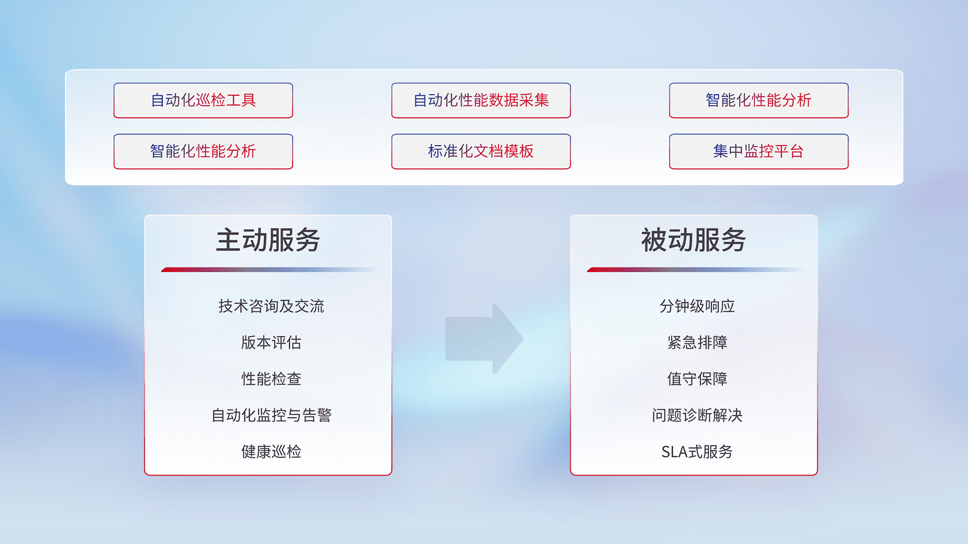 智能化工具和标准化文档,,,,保障服务质量,,,,提供主动服务(包含技术咨询、、版本评估、、性能检查、、、、自动化监控与告警、、健康巡检)和被动服务包含(分钟级响应、、、、紧急排障、、值守保障、、、、问题诊断解决、、、SLA服务)。。