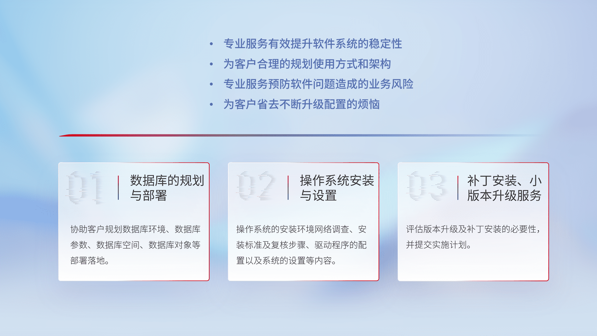 为客户提供软件规模升级、、快速部署、、、按需配置的专业服务,,,从数据库的规划与部署到操作系统的安装与设置,,,,再到补丁安装和小版本升级提供支持。。。。